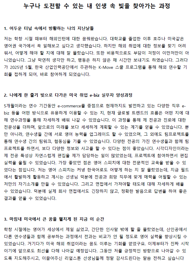 회사소개 ㈜리얼스톤 CEO 소개 회사연혁 History 오시는길 국비지원 해외취업연수과정(K-Move스쿨) 국비지원 해외취업연수과정(K-Move스쿨) 자료실 인턴십&취업 인턴십 어학연수 교육센터 글로벌인재양성장학프로그램 국내 교육 연수과정 해외프로그램 리얼스톤의 강점 NOTICE 공지사항 인턴 합격자 소식 대사관 합격자 소식 그 외 자료실 로그인 회원가입 국비지원 해외취업연수과정(K-Move스쿨) 자료실 국비지원 해외취업연수과정(K-Move스쿨) 자료실 자료실 Home > 국비지원 해외취업연수과정(K-Move스쿨) > 자료실 자료실 리얼스톤 History 인턴십의 중요성 장학프로그램 후기 장학프로그램 자료실 인턴 합격자 소식 대사관 합격자 소식 그 외 자료실 실제 인턴십 학생 실시간 현황 자료실 갤러리게시판 공지사항 1:1문의 학생의 인턴십 후기 [10기] 연수생(시각디자인학과) 후기 관리자 / 2026-02-23 썸네일 11-안혜인.png (대표) 목록