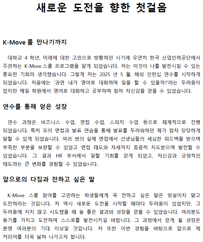 회사소개 ㈜리얼스톤 CEO 소개 회사연혁 History 오시는길 국비지원 해외취업연수과정(K-Move스쿨) 국비지원 해외취업연수과정(K-Move스쿨) 자료실 인턴십&취업 인턴십 어학연수 교육센터 글로벌인재양성장학프로그램 국내 교육 연수과정 해외프로그램 리얼스톤의 강점 NOTICE 공지사항 인턴 합격자 소식 대사관 합격자 소식 그 외 자료실 로그인 회원가입 국비지원 해외취업연수과정(K-Move스쿨) 자료실 국비지원 해외취업연수과정(K-Move스쿨) 자료실 자료실 Home > 국비지원 해외취업연수과정(K-Move스쿨) > 자료실 자료실 리얼스톤 History 인턴십의 중요성 장학프로그램 후기 장학프로그램 자료실 인턴 합격자 소식 대사관 합격자 소식 그 외 자료실 실제 인턴십 학생 실시간 현황 자료실 갤러리게시판 공지사항 1:1문의 학생의 인턴십 후기 [10기] 연수생(경영학과) 후기 관리자 / 2026-02-23 썸네일 1-최현주.png (대표) 목록