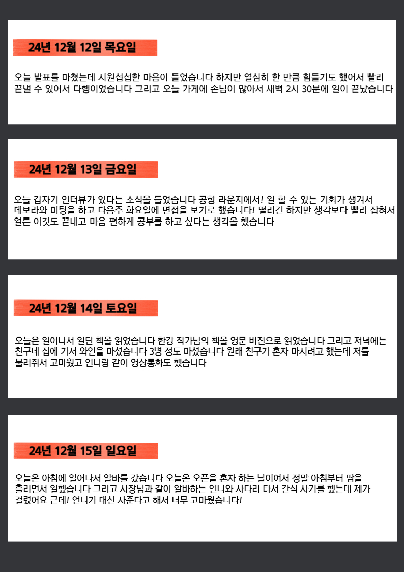회사소개 ㈜리얼스톤 CEO 소개 회사연혁 History 오시는길 국비지원 해외취업연수과정(K-Move스쿨) 국비지원 해외취업연수과정(K-Move스쿨) 자료실 인턴십&취업 인턴십 어학연수 교육센터 글로벌인재양성장학프로그램 국내 교육 연수과정 해외프로그램 리얼스톤의 강점 NOTICE 공지사항 인턴 합격자 소식 대사관 합격자 소식 그 외 자료실 로그인 회원가입 교육센터 실제 인턴십 학생 실시간 현황 글로벌인재양성장학프로그램 국내 교육 연수과정 해외프로그램 리얼스톤의 강점 실제 인턴십 학생 실시간 현황 Home > 교육센터 > 실제 인턴십 학생 실시간 현황 OVERSEAS PROGRAM 해외프로그램 학생의 인턴십 후기 실제 인턴십 학생 실시간 현황 리얼스톤 History 인턴십의 중요성 장학프로그램 후기 장학프로그램 자료실 인턴 합격자 소식 대사관 합격자 소식 그 외 자료실 실제 인턴십 학생 실시간 현황 자료실 갤러리게시판 공지사항 1:1문의 학생의 인턴십 후기 [캐나다] 인턴십 4개월차 (24/12/02~24/12/09) 관리자 / 2025-07-04 썸네일 [홈페이지] 캐나다 4개월차.jpg (대표) 목록