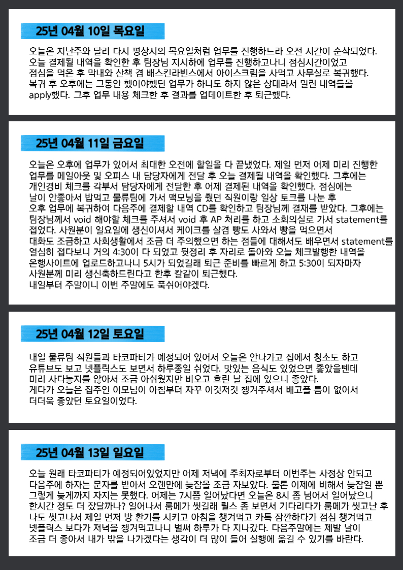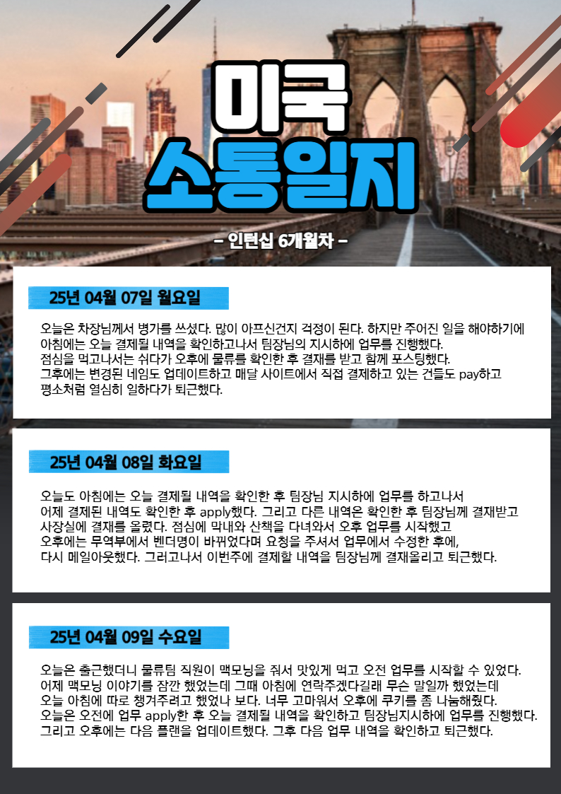 회사소개 ㈜리얼스톤 CEO 소개 회사연혁 History 오시는길 국비지원 해외취업연수과정(K-Move스쿨) 국비지원 해외취업연수과정(K-Move스쿨) 자료실 인턴십&취업 인턴십 어학연수 교육센터 글로벌인재양성장학프로그램 국내 교육 연수과정 해외프로그램 리얼스톤의 강점 NOTICE 공지사항 인턴 합격자 소식 대사관 합격자 소식 그 외 자료실 로그인 회원가입 교육센터 실제 인턴십 학생 실시간 현황 글로벌인재양성장학프로그램 국내 교육 연수과정 해외프로그램 리얼스톤의 강점 실제 인턴십 학생 실시간 현황 Home > 교육센터 > 실제 인턴십 학생 실시간 현황 OVERSEAS PROGRAM 해외프로그램 학생의 인턴십 후기 실제 인턴십 학생 실시간 현황 리얼스톤 History 인턴십의 중요성 장학프로그램 후기 장학프로그램 자료실 인턴 합격자 소식 대사관 합격자 소식 그 외 자료실 실제 인턴십 학생 실시간 현황 자료실 갤러리게시판 공지사항 1:1문의 학생의 인턴십 후기 [미국] 인턴십 6개월차 (25/04/07~24/04/13) 관리자 / 2025-11-27 썸네일 미국 6개월차.jpg (대표) 목록