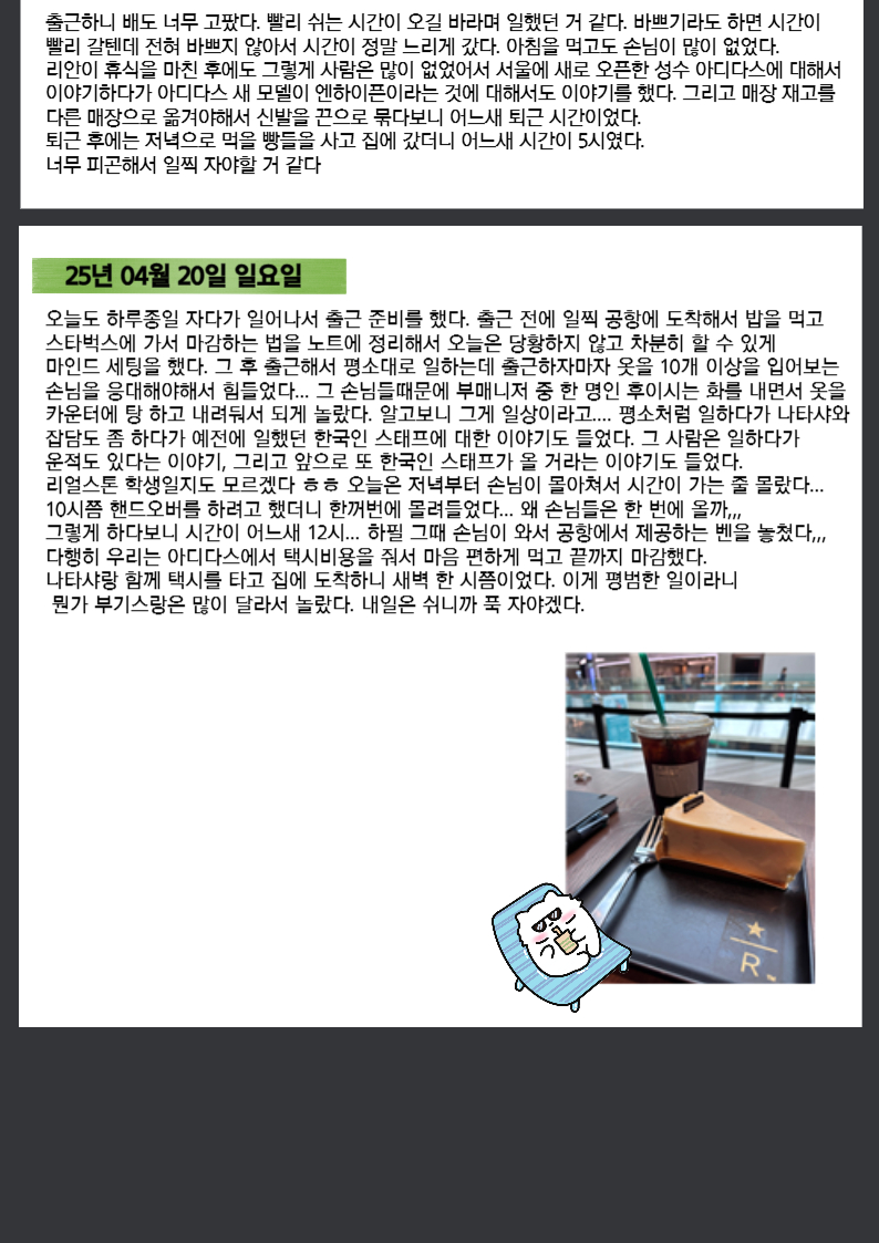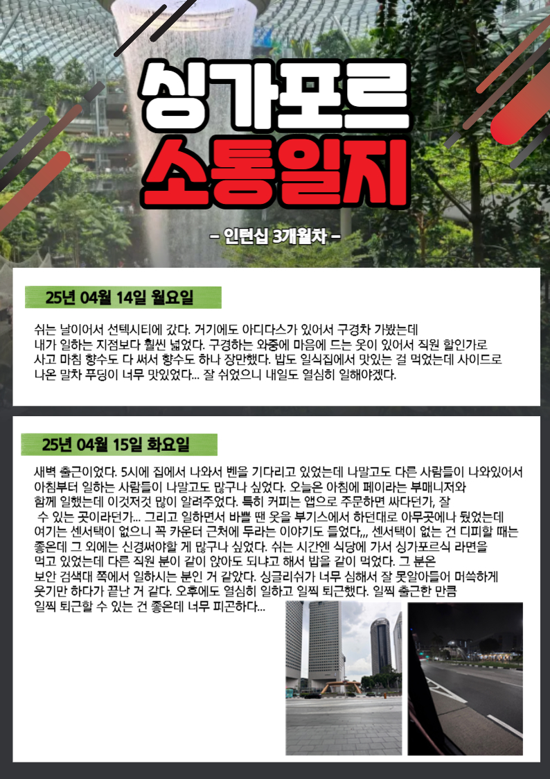 회사소개 ㈜리얼스톤 CEO 소개 회사연혁 History 오시는길 국비지원 해외취업연수과정(K-Move스쿨) 국비지원 해외취업연수과정(K-Move스쿨) 자료실 인턴십&취업 인턴십 어학연수 교육센터 글로벌인재양성장학프로그램 국내 교육 연수과정 해외프로그램 리얼스톤의 강점 NOTICE 공지사항 인턴 합격자 소식 대사관 합격자 소식 그 외 자료실 로그인 회원가입 교육센터 실제 인턴십 학생 실시간 현황 글로벌인재양성장학프로그램 국내 교육 연수과정 해외프로그램 리얼스톤의 강점 실제 인턴십 학생 실시간 현황 Home > 교육센터 > 실제 인턴십 학생 실시간 현황 OVERSEAS PROGRAM 해외프로그램 학생의 인턴십 후기 실제 인턴십 학생 실시간 현황 리얼스톤 History 인턴십의 중요성 장학프로그램 후기 장학프로그램 자료실 인턴 합격자 소식 대사관 합격자 소식 그 외 자료실 실제 인턴십 학생 실시간 현황 자료실 갤러리게시판 공지사항 1:1문의 학생의 인턴십 후기 [싱가포르] 인턴십 3개월차 (25/04/14~25/04/20) 관리자 / 2025-12-01 썸네일 싱가포르 3개월차.jpg (대표) 목록