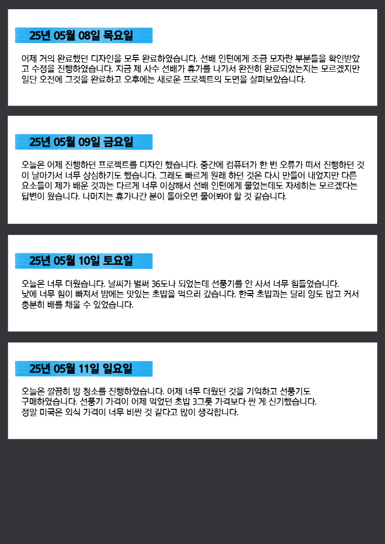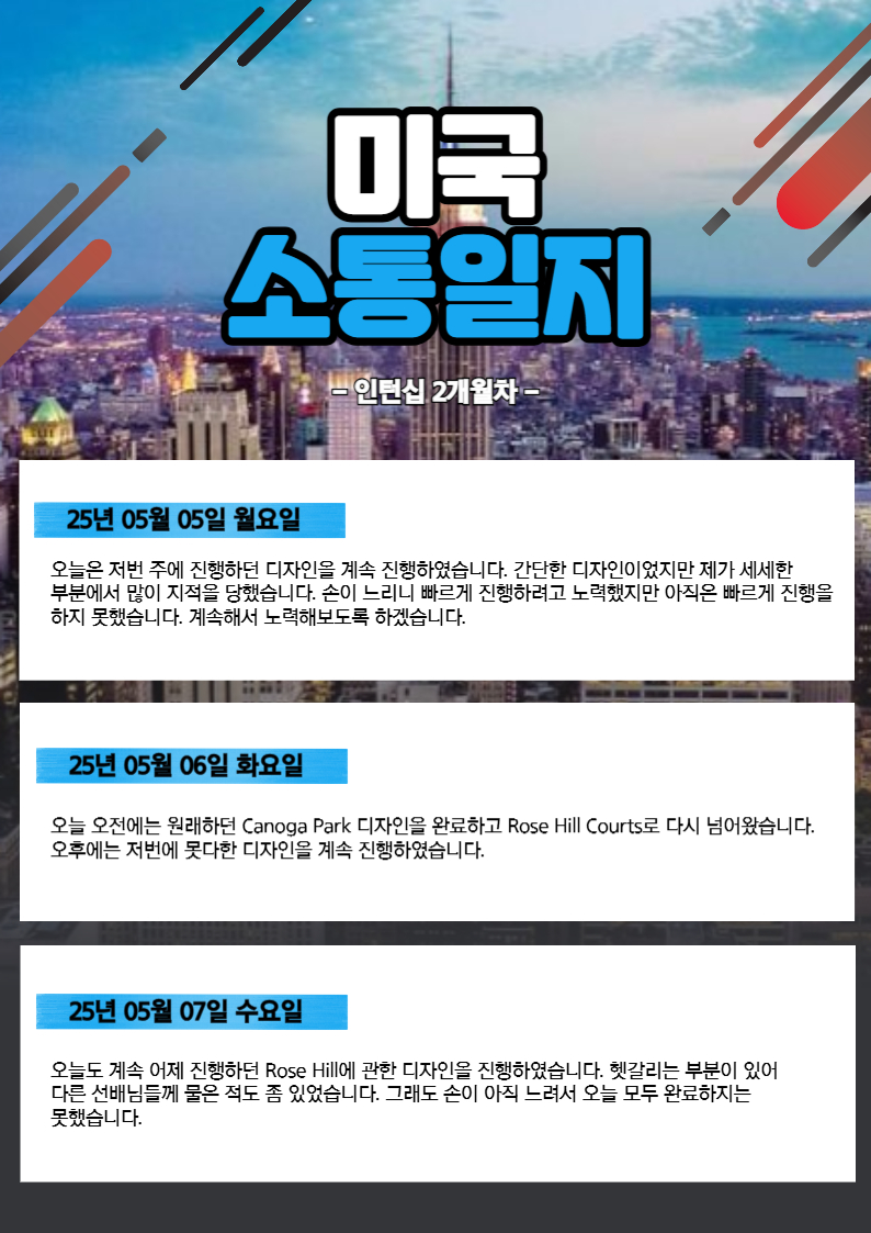 회사소개 ㈜리얼스톤 CEO 소개 회사연혁 History 오시는길 국비지원 해외취업연수과정(K-Move스쿨) 국비지원 해외취업연수과정(K-Move스쿨) 자료실 인턴십&취업 인턴십 어학연수 교육센터 글로벌인재양성장학프로그램 국내 교육 연수과정 해외프로그램 리얼스톤의 강점 NOTICE 공지사항 인턴 합격자 소식 대사관 합격자 소식 그 외 자료실 로그인 회원가입 교육센터 실제 인턴십 학생 실시간 현황 글로벌인재양성장학프로그램 국내 교육 연수과정 해외프로그램 리얼스톤의 강점 실제 인턴십 학생 실시간 현황 Home > 교육센터 > 실제 인턴십 학생 실시간 현황 OVERSEAS PROGRAM 해외프로그램 학생의 인턴십 후기 실제 인턴십 학생 실시간 현황 리얼스톤 History 인턴십의 중요성 장학프로그램 후기 장학프로그램 자료실 인턴 합격자 소식 대사관 합격자 소식 그 외 자료실 실제 인턴십 학생 실시간 현황 자료실 갤러리게시판 공지사항 1:1문의 학생의 인턴십 후기 [미국] 인턴십 2개월차 (25/05/05~25/05/11) 관리자 / 2025-12-04 썸네일 미국 2개월차.jpg (대표) 목록