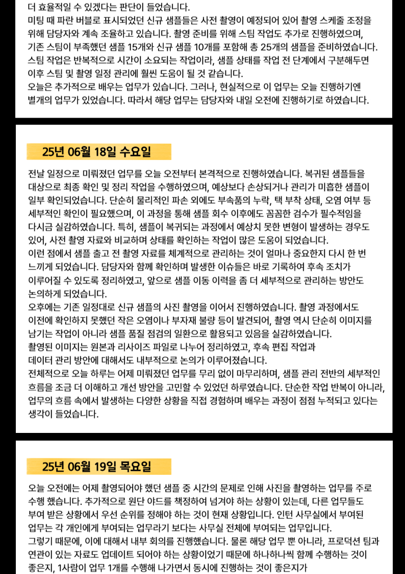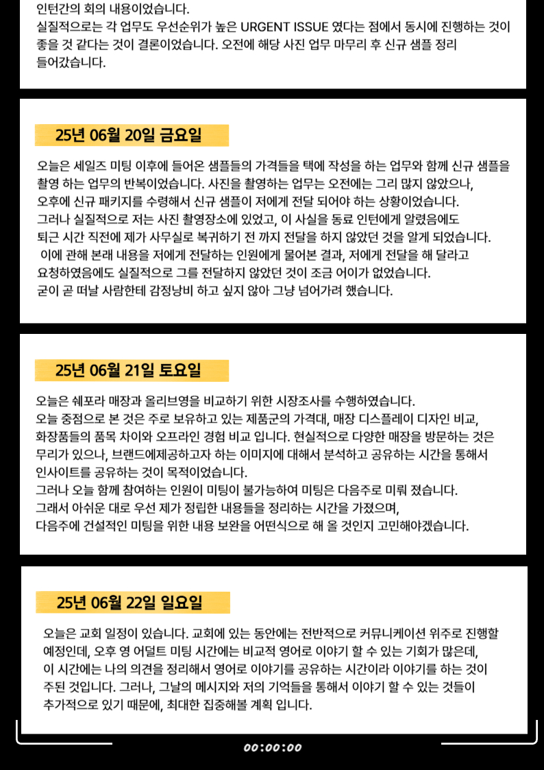 회사소개 ㈜리얼스톤 CEO 소개 회사연혁 History 오시는길 국비지원 해외취업연수과정(K-Move스쿨) 국비지원 해외취업연수과정(K-Move스쿨) 자료실 인턴십&취업 인턴십 어학연수 교육센터 글로벌인재양성장학프로그램 국내 교육 연수과정 해외프로그램 리얼스톤의 강점 NOTICE 공지사항 인턴 합격자 소식 대사관 합격자 소식 그 외 자료실 로그인 회원가입 교육센터 실제 인턴십 학생 실시간 현황 글로벌인재양성장학프로그램 국내 교육 연수과정 해외프로그램 리얼스톤의 강점 실제 인턴십 학생 실시간 현황 Home > 교육센터 > 실제 인턴십 학생 실시간 현황 OVERSEAS PROGRAM 해외프로그램 학생의 인턴십 후기 실제 인턴십 학생 실시간 현황 리얼스톤 History 인턴십의 중요성 장학프로그램 후기 장학프로그램 자료실 인턴 합격자 소식 대사관 합격자 소식 그 외 자료실 실제 인턴십 학생 실시간 현황 자료실 갤러리게시판 공지사항 1:1문의 학생의 인턴십 후기 [미국] 인턴 보고서 4개월차 (25/06/16~25/06/22) 관리자 / 2025-12-16 썸네일 미국 4개월차.png (대표) 목록