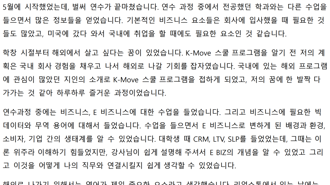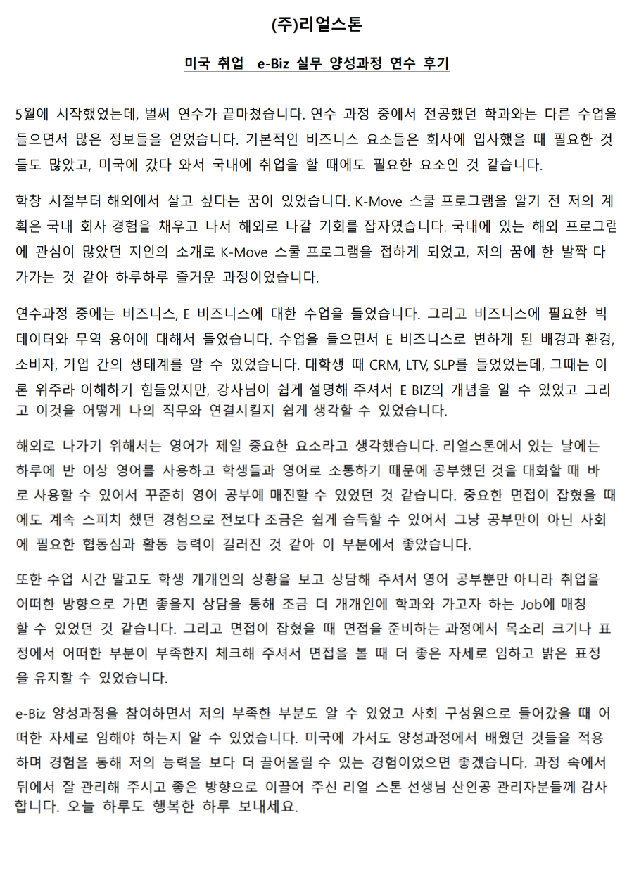 회사소개 ㈜리얼스톤 CEO 소개 회사연혁 History 오시는길 국비지원 해외취업연수과정(K-Move스쿨) 국비지원 해외취업연수과정(K-Move스쿨) 자료실 인턴십&취업 인턴십 어학연수 교육센터 글로벌인재양성장학프로그램 국내 교육 연수과정 해외프로그램 리얼스톤의 강점 NOTICE 공지사항 인턴 합격자 소식 대사관 합격자 소식 그 외 자료실 로그인 회원가입 국비지원 해외취업연수과정(K-Move스쿨) 자료실 국비지원 해외취업연수과정(K-Move스쿨) 자료실 자료실 Home > 국비지원 해외취업연수과정(K-Move스쿨) > 자료실 자료실 리얼스톤 History 인턴십의 중요성 장학프로그램 후기 장학프로그램 자료실 인턴 합격자 소식 대사관 합격자 소식 그 외 자료실 실제 인턴십 학생 실시간 현황 자료실 갤러리게시판 공지사항 1:1문의 학생의 인턴십 후기 [4기] 연수생(텍스타일디자인학과) 후기 관리자 / 2024-04-30 썸네일 023.png (대표) 목록