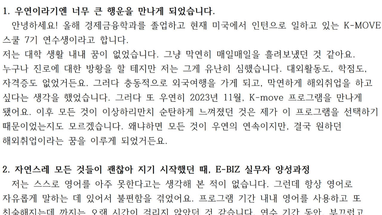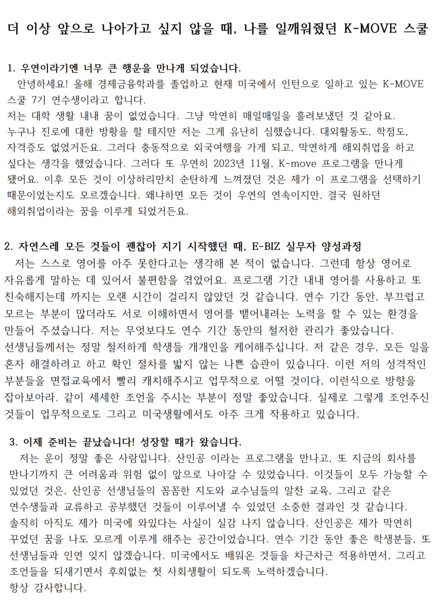 회사소개 ㈜리얼스톤 CEO 소개 회사연혁 History 오시는길 국비지원 해외취업연수과정(K-Move스쿨) 국비지원 해외취업연수과정(K-Move스쿨) 자료실 인턴십&취업 인턴십 어학연수 교육센터 글로벌인재양성장학프로그램 국내 교육 연수과정 해외프로그램 리얼스톤의 강점 NOTICE 공지사항 인턴 합격자 소식 대사관 합격자 소식 그 외 자료실 로그인 회원가입 국비지원 해외취업연수과정(K-Move스쿨) 자료실 국비지원 해외취업연수과정(K-Move스쿨) 자료실 자료실 Home > 국비지원 해외취업연수과정(K-Move스쿨) > 자료실 자료실 리얼스톤 History 인턴십의 중요성 장학프로그램 후기 장학프로그램 자료실 인턴 합격자 소식 대사관 합격자 소식 그 외 자료실 실제 인턴십 학생 실시간 현황 자료실 갤러리게시판 공지사항 1:1문의 학생의 인턴십 후기 [7기] 연수생 (경제긍융학과) 후기 관리자 / 2024-05-03 썸네일 061.png (대표) 목록