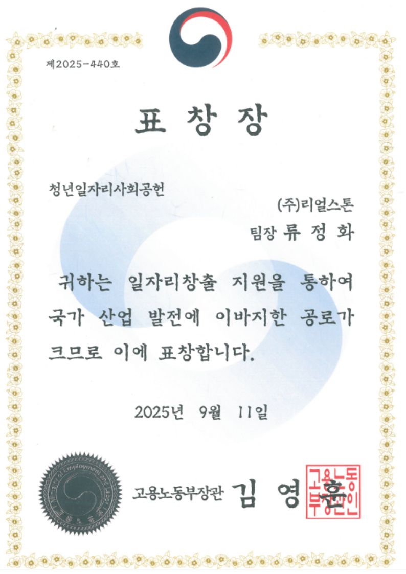 [리얼스톤] 청년일자리사회공헌 고용노동부장관 '표창장' 수상